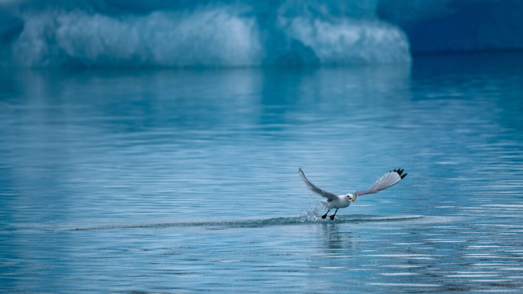La foto fue tomada en la playa del campamento de Qaleraliq, desde el que se tiene una visión privilegiada del frente glaciar. Y donde queda de manifiesto la productividad de sus frías aguas, ya que de manera continuada gaviotas y gaviones se zambullen en busca de alimento. La foto recoge el momento en que una gaviota tridáctila (Rissa tridactyla) captura un capelán o capelín (Mallotus villosus), muy abundante en las aguas groenlandesas.