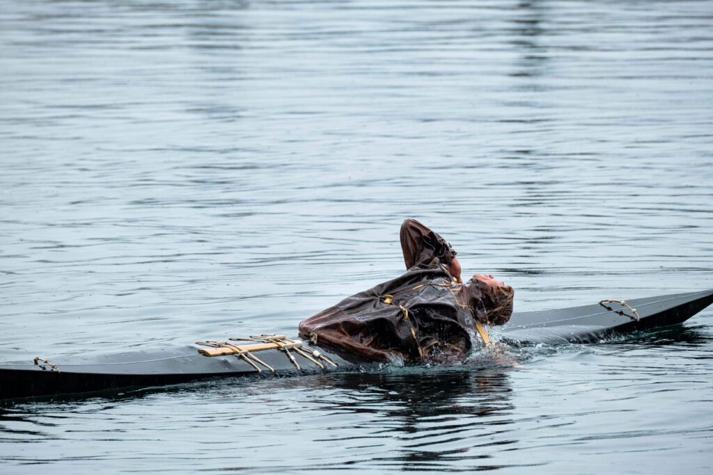 En nuestra bajada hacia el sur llegamos a Qaqortoq, donde casualmente tendría lugar el Campeonato nacional de kayaks, un evento que atrae a grandes y pequeños, y donde prácticamente éramos los únicos turistas. Aún hoy en día el traje (akuilisaq) está hecho de piel de foca. Aunque son varias las disciplinas que tienen lugar, sin duda lo más impresionante de esta actividad es cuando hacen el “rolling”, donde con gran esfuerzo giran sobre sí mismos, con sus brazos y remo a la espalda en formas imposibles.