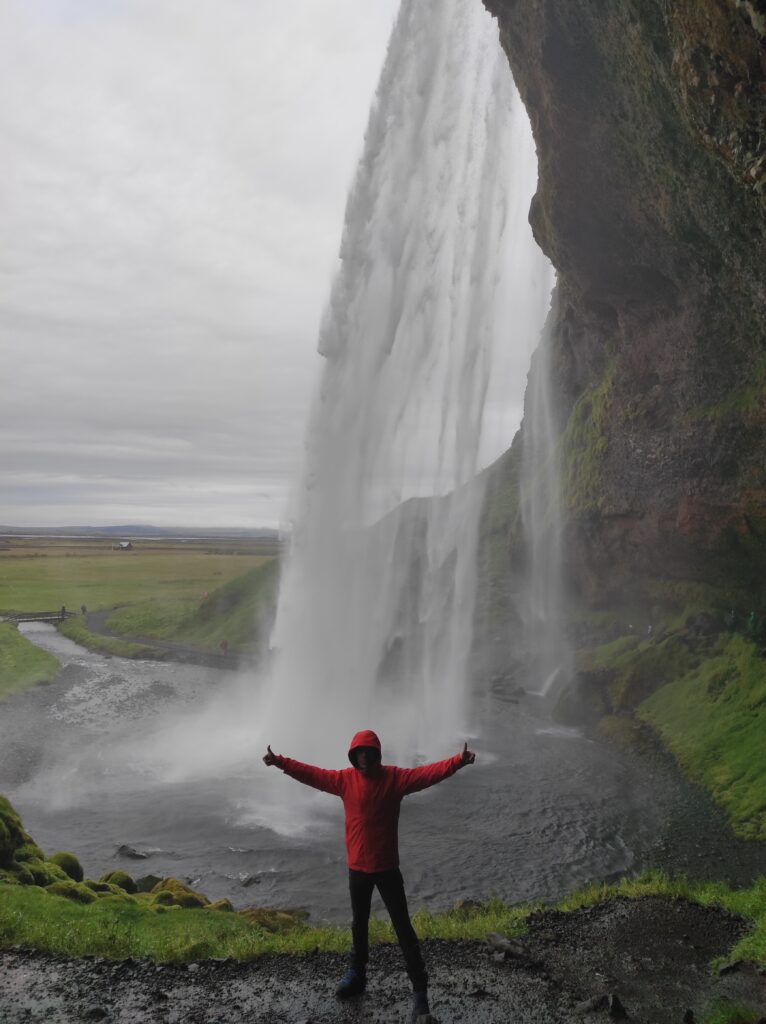 Breve descripción personal de la foto: Cantando bajo la lluvia/cascada de Seljalandsfoss